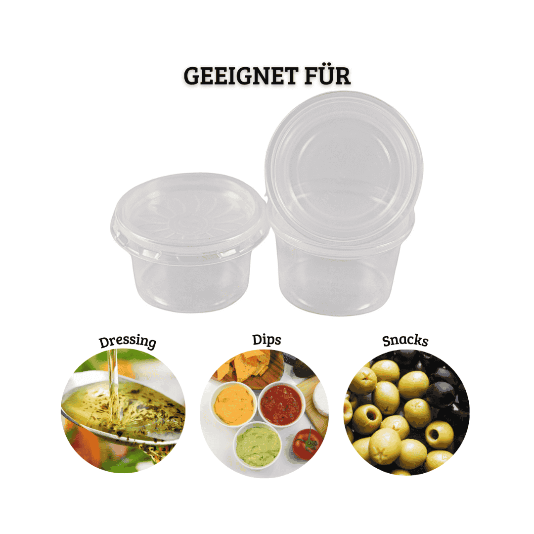 Vielseitig einsetzbar: Ob für Salatdressings, Ketchup, Senf oder deine Lieblingssaucen – diese Becher mit dicht schließenden Deckeln sorgen dafür, dass alles frisch bleibt und unterwegs nichts ausläuft. Sie sind perfekt für Take-Away, deine Lunchbox, Picknicks und Partys.