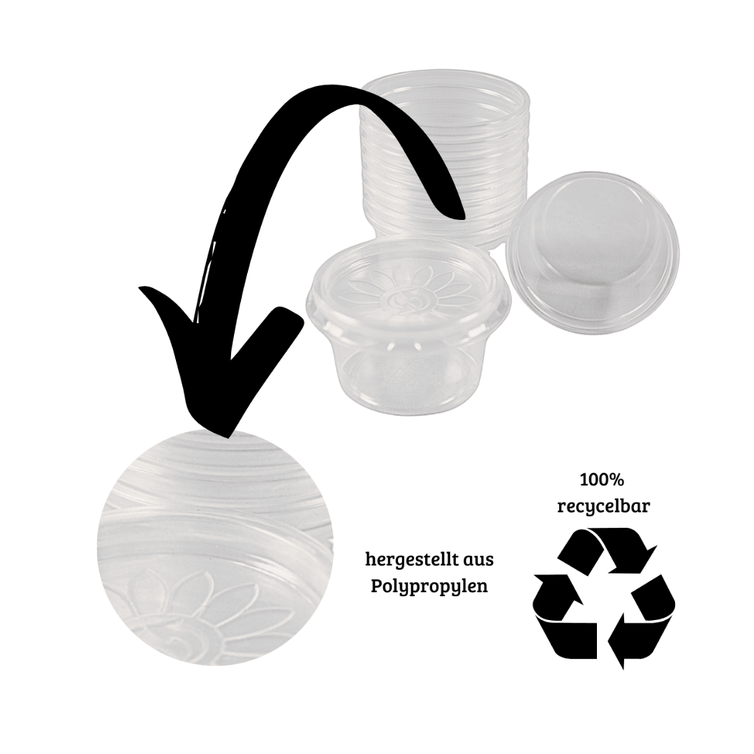 Für umweltbewusste Betriebe sind die Saucenbecher aus recycelbaren Polypropylen die ideale Verpackungslösung. Hergestellt aus vollständig recycelbarem Material, sind sie robust und dennoch leicht zu entsorgen. Dank der praktischen Größe können Sie die Probierbehälter platzsparend lagern. Durch die umweltfreundliche Herstellung passen die mini Portionsbecher perfekt zu Gastronomiebetrieben, die verantwortungsvoll handeln möchten. Kombinieren Sie Stil und Funktionalität mit einer nachhaltigen Verpackung, die bei Ihren Gästen garantiert gut ankommt.