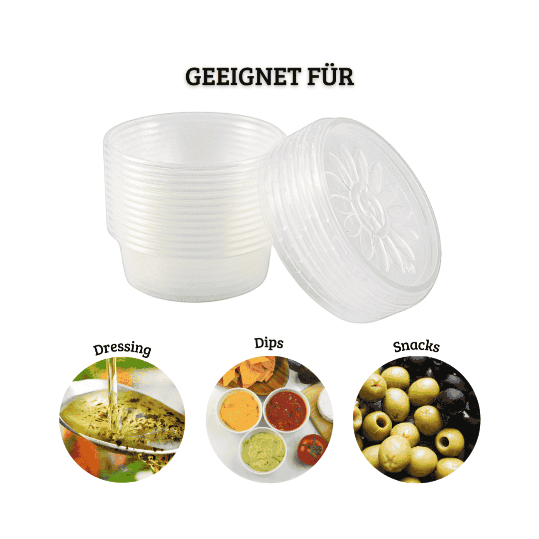 Vielseitig einsetzbar: Ob für Salatdressings, Ketchup, Senf oder deine Lieblingssaucen – diese Becher mit dicht schließenden Deckeln sorgen dafür, dass alles frisch bleibt und unterwegs nichts ausläuft. Sie sind perfekt für Take-Away, deine Lunchbox, Picknicks und Partys.