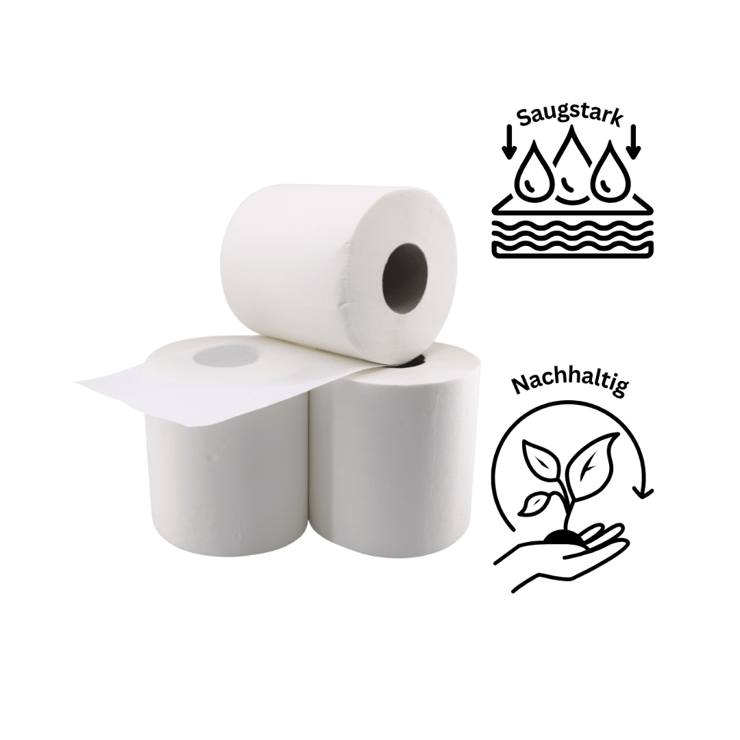 Dank des robusten Zellstoffmaterials bieten unsere Papierhandtücher optimale Saugfähigkeit und sind reißfest, sodass sie selbst den härtesten Reinigungsaufgaben standhalten. Die großzügige Länge jeder Rolle sorgt dafür, dass Sie umfangreiche Reinigungsarbeiten ohne häufige Unterbrechungen durchführen können.